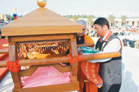 大樹區竹寮里里長吳秉宏將珍寶放入轎內。圖/人間社記者蘇少暘