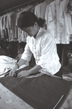 頸部是衣服最容易磨破的地方,為了可以穿久不壞,藍衫的頸圍一直以來都是用七層布料特製,高一‧五公分的「硬頸」,是藍衫最講究的部分,也最考驗師傅的手藝,店內的年輕師傅還特地拿尺量給我們看。