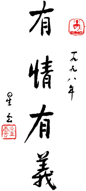 爾虞我詐、鬥亂紛爭都是社會的病態,我們有幸身為萬物靈長,何不承擔起做人的責任,用「有情有義」的態度來面對人生,溫暖世間呢?