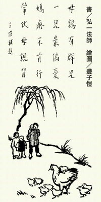對照結果,到底是人類母親的愛多一點呢?或是母雞的愛更多?其實,毋庸比較,母愛是沒有任何條件的,是人類和有情識的動物與生俱來的最真純的愛。這幅圖畫由豐子愷先生親自作詩,詩云:「母雞有群兒,一兒最偏愛。」這種情形,跟人類的母親不是很像嗎?一位婦人,生了幾個孩子,每個孩子個性不同,有的乖巧聽話又貼心,有的懂得察言觀色和見風轉舵,有的處處忤逆惹人生氣,如此情形之下,做母親的很難公平對待每一個孩子,總有比較偏愛的一個,這是很難免的。