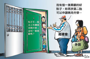 其次,目前不少父母傾向聘雇外勞,因為外勞不僅照顧孩子,也可打理家務或幫忙做生意,由於具有內政部核發執照的國內家務處理員或托育員,因薪資較高,一旦放寬外勞,必然排擠國內幫傭、托育等行業及人員。