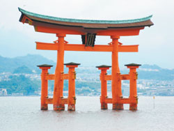 而使嚴島神社聲名遠播,名揚海內外的主因,在於興建自六世紀原名叫神社島的宮島,其中一部分結構建築於海水中,尤其那一座坐落在海中的大鳥居更富盛名,人們到嚴島神社來,無不被那座大紅鳥居吸引;能夠親睹漲潮時的海中鳥居,或親近退潮後,孤立在沙灘上的鳥居,千秋各異,互為朝聖者最大的趣事。