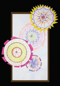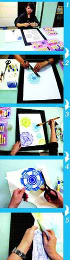 使用媒材:雪銅紙、厚紙板、彩色筆、清水、洗筆筒、排筆、水彩筆、兩腳釘、剪刀、圓規、直尺。