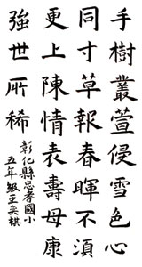《小書法家》 |2011.03.02 語音朗讀 466觀看次 字級 大 中 小 王奕棋(彰化縣忠孝國小五年九班)陳品瑜(屏東縣勝利國小六年一班) 前一篇文章 《深具意義》珍貴的禮物 下一篇文章 《寫作心法36招》寫植物---遠近結合法 熱門新聞 01【閃文集】火星暗斑之謎2025.12.1602包錦蓉:我可以逆風高飛2025.12.1303佛光穿透鐵窗 佛光山監獄佈教 70 年2025.12.1304【詩】草螟公2025.12.1805遠離初老&改善骨鬆的解方2025.12.1306【詩】 航夢2025.12.1507【為人父母】 允許如其所是2025.12.1508東方微笑跨越千年 麥積山石窟現佛館2025.12.1509寶塔寺 三代同堂搓湯圓、繪燈籠2025.12.1610人間佛教在菲律賓2025.12.14 訂閱電子報 台北市 天氣預報 台灣一週天氣預報 相關報導 【快樂塗鴉簿】享受美好時光【小藝術家】我的夢想家園【天南地北聊音樂】冬日裡的雪之舞蹈【快樂塗鴉簿】去郵局寄信【趣味動物園】水中的優雅舞者── 天鵝【快樂塗鴉簿】 飛向浩瀚的宇宙