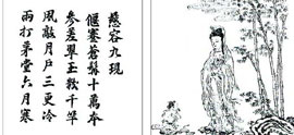 慈容九現的版畫,以竹林為境,林中有一觀音,觀音手持念珠,腳踏蓮花,呈立姿,左下首次出現童子,此童子應該就是善財童子,畫面呈跪拜狀,頗有善財童子訪普莊嚴園林參見休捨優婆夷的寫照。