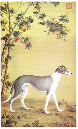 〈竹蔭西狑圖〉為畫家郎世寧所繪。翠竹兩竿,交錯曲上,竹枝間纏繞苦瓜藤,綠葉青青,瓜瓞相望;竹枝苦瓜之下立一隻黑白相間獵犬,體修肢健,小首長吻,目光炯炯。用精細之筆刻畫動、植物明暗向背,陰陽凸凹,全部景物立體感很強,圖右上角鈐「怡親王寶」朱文方璽。該作品為瀋陽故宮博物院的鎮館之寶。