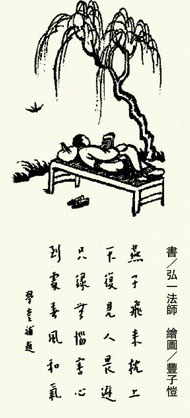 為何會有這樣不知危險且不怕死的燕子呢?「只緣無惱害心,到處春風和氣。」哇!原來是這位專心於榻上閱讀的男子,身上散發著一種無以名狀的和諧之氣,他一點也沒有想要驅趕或射殺燕子的心意;燕子也是有靈性的,牠聞嗅得到這股如春風般的愉悅平和之氣場,並被這氣場所吸引,因此,能無所畏懼地在男子枕邊飛翔嬉戲。