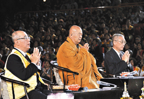 北區禪淨密三修法會中,國際佛光會中華總會榮譽總會長吳伯雄(左起)、佛光山開山星雲大師、行政院長吳敦義,一起合掌為日本、全世界人民祝禱。圖/人間社記者莊美昭