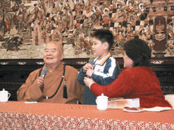「小朋友好!我與你們同年紀時,就有一個想法,就是要給人歡喜,給人歡喜自己才能快樂生活!如何給爸媽歡喜、老師歡喜?」大師和藹可親的告訴小朋友說,「聽話」很要緊,聽父母話,勤勞認真打掃、應對,爸媽心中就快樂;聽老師話,用功讀書、禮貌守規矩,讓人家歡喜、接受我,彼此都歡喜快樂。