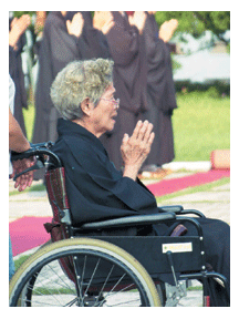 圖說:陳黃錦英雖然年紀大且行動不便,但她仍堅持坐輪椅跟在隊伍後面念佛、合掌、敬禮。人間社記者羅熙珍攝