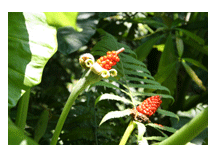 姑婆芋,是台灣低海拔常見的植物,喜歡潮溼的環境,常在山溝、河邊、路旁生長,根莖粗大且葉片寬廣,而果實排列的方式就像玉蜀黍一般,一顆顆緊連環狀在一起,顏色呈現紅色。但一定要注意喔!