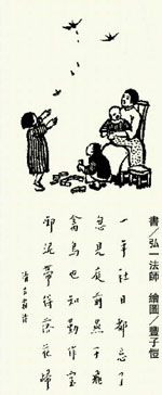 這幅〈啣泥帶得落花歸〉,是豐子愷先生詮釋清朝詩人呂霜所寫七言詩的畫作。圖中,一位忙碌的家庭主婦,正偷閒陪孩子玩遊戲。說是偷閒,其實一點也不得閒,她懷抱著、哄著幼小的孩童,兩眼視線不離兩個稍大的兒女。孩子一個蹲在地上玩積木,一個正發現新大陸似的被啣泥歸來的燕子所吸引。小女孩見到燕子飛來,想必歡喜地驚呼,且呼叫母親和弟弟趕緊也一起看。