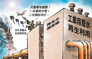 筆者看到新聞報導不禁感慨,政府主管單位與企業對廢水回收再利用,為何等到台灣有「無水」之虞,才要臨渴掘井?而且,既然再生水比自來水質還優良,代表回收廢水再利用是「非不能也,是不為也」。