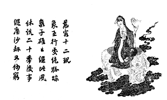 版畫主要以陰刻呈現觀音,菩薩一手持缽,一手持楊柳,端坐於白象上,駕雲飛騰。另以陽刻呈現座騎「大白象」,在創作者刻意的強調下,「大白象」的意像讓人聯想到菩薩「忍辱負重」的精神。