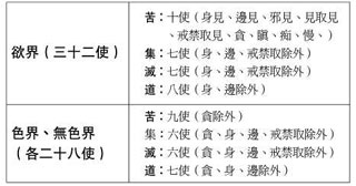 集諦中,有五鈍使、五利使(注{1}、{2})的煩惱,如是十使的煩惱,皆是從空所生。此十使與三界、四聖諦配合,共八十八使:(1)欲界:苦諦具十使,集諦具七使,滅諦具七使,道諦具八使,共三十二使。(2)色界:苦諦具九使,集諦具六使,滅諦具六使,道諦具七使,共二十八使。(3)無色界:苦諦具九使,集諦具六使,滅諦具六使,道諦具七使,共二十八使。