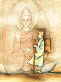 漢明感夢,使往祈法,便獲迦葉摩騰等至洛陽。後騰姊子作沙門,持此瑞像,方達此國,所在圖之;未幾齎像西返,而此圖傳,不甚流廣。魏晉已來,年載久遠,又經滅法,經像湮除;此之瑞跡,殆將不見。