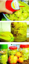 3將去青澀後的楊桃片裝罐,層層疊疊鋪入冰糖裝罐,喜甜者則層層鋪糖,約一個鐘頭後,就會開始軟化起變化。