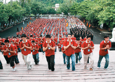 【人間社記者賴台生、陳凱勛大樹報導】從晨曦微明到毫光萬丈;從高齡銀髮族到妙齡e世代,五日凌晨五時許,一千多位來自台灣各地、金門、馬祖及來自全世界十五個國家的佛青三步一拜,齊聚不二門廣場,教師五顏六色的服裝與青年團鮮紅的T恤,讓廣場頓時鮮明起來。清晨五時三十分,悠揚的佛號聲響起,千餘名朝山信眾,虔心跪拜,場面隆重莊嚴。