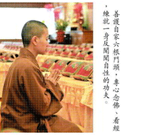 當六根往外奔馳時,心一天到晚都在外頭跑,很散亂沒有主。讓六根學習回到自心的家,往內看自己的起心動念,聽自己內在的音聲……每天從五分鐘開始,再增加到十分鐘,即所謂的練功夫。籃球員是一顆球一顆球投籃的練,修行人要一個念一個念抓回來的練,練久了就有功夫。觀世音菩薩反聞聞自性,便是這道理。