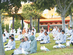 圖說:南天寺舉辦的各項活動,獲得澳洲政府和當地居民的肯定和好評。圖為禪修者體驗戶外禪,祥和寧靜的氛圍也吸引海鳥加入。圖/南天寺提供