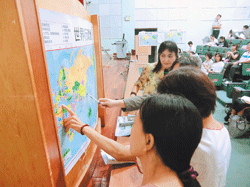 會中,劉秀勤透過世界大地圖並配合《人間福報》進行教學示範,劉秀勤為大家介紹如何以圖像記憶的方式認識世界各國地理位置,邀請老師透過報紙、學習單、地圖來尋找國家位置,吸引許多老師熱烈參與。
