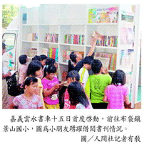 雲水書車十五日駛進景山國小校門時,校長周育賢已帶領全校師生列隊歡迎,小朋友由老師帶領,分批前往雲水書車借閱,在有教法師、朴子分會長楊明財及義工的導讀下,小朋友踴躍翻閱科學繪本、童話故事,氣氛十分熱烈。
