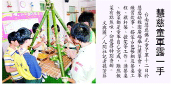 慧慈童軍露一手 孫芳菲 |2011.06.17 語音朗讀 820觀看次 字級 大 中 小 台南慧慈佛光童子軍十二日於慧慈幼稚園廣場舉行團集會,童軍練習炊事、搭蒙古包帳棚及餐桌工程、旗杆架、擔架等工作。連餐桌、飯菜都是童軍自己完成,雖然飯菜有點焦味,卻覺得特別香甜。文與圖/人間社記者孫芳菲 前一篇文章 萬年寺禪修 風靡馬尼拉書局 下一篇文章 江素惠佛光山演講 跨國界關懷 佛光精神傳遍全世界 熱門新聞 01與精品品牌撞鞋 印度涼鞋打專利戰2025.12.2102佛光山高雄佛教堂 營建工地評鑑特優2025.12.1903銀杏點亮.東京印象2025.12.2304太陽瓶燈泡 點亮貧困家庭希望 2025.12.1905邂逅佛教 安頓身心2025.12.2106【時光重逢】花宅海邊美術館2025.12.1907【動物奧斯卡獎】猜猜誰最會演(上)2025.12.2108北島佛光山獲四星肯定 園林躍升具重要意義庭園2025.12.1909日球星率道奇連霸 2025體壇最驚奇 2025.12.1910社論--瞋恨的危害2025.12.21 訂閱電子報 台北市 天氣預報 台灣一週天氣預報 相關報導 緬懷星雲大師 全球佛教學者暢談人間佛教245校雲端交流 凝聚三好共識推廣生命教育 林聰明獲特殊貢獻獎西方寺瑜伽課 接引民眾結法緣元宵乞龜 390兩大金龜亮相基督城地震10年 佛光山領眾祈願 作者其他文章巡山集印 最佳親子聯誼愛開始行動 陳順章、蘇素賢 成就四代安樂之家佛光童軍服務員研習營-- 覺培法師鼓勵多讀經 助人益己 佛光童軍包粽子