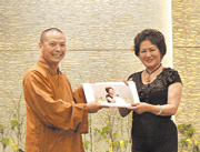 香江文化交流基金會主席江素惠(右)至佛光山演講,都監院院長慧傳法師致贈照片留念。圖/人間社記者張菁菁
