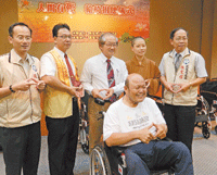 佛光人捐贈二十七 輛輪椅給嘉義市府,殘障協會理事長張天瑞(前排坐者)更高興地試坐輪椅。圖/人間社記者妙維