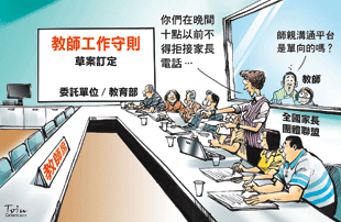 媒體報導,教育部委託全國家長團體聯盟,訂出「教師工作守則」草案,其中教師在晚間十點以前不得拒接家長電話,教師必須提供學校以外的聯絡電話給家長。