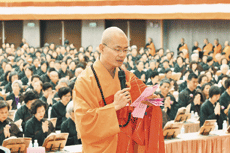 佛光山百萬人興學大悲懺法會北區場,二十五、二十六日於佛光大學懷恩館舉行,總計有五千位興學委員及信徒參與盛會。圖為佛光山寺住持心培和尚為法會主法。圖/人間社記者周俊雄