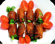 3.將做法2的年糕一一攤開,包入作法1的餡料,捲成短笛狀即可食用。