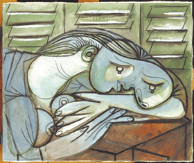 百葉窗前沉睡的女子 |2011.07.04 語音朗讀 2118觀看次 字級 大 中 小 〈百葉窗前沉睡的女子〉描繪女子趴在桌上小睡,雖然是我們熟悉的日常動作,但是形體則嚴重的變形。肖像的鼻子被安排到頭部的右側邊緣使整張臉有如一個蠶豆,嘴巴和耳朵同是側面,但是鼻子卻描繪成正面,畢卡索沿著鼻樑用兩個顏色區分了鼻子的兩側,兩個鼻孔清晰可見的並排在一起。至於一雙眼睛則朝向同一方向,它們的位置遠離了現實經驗,反而像是平均地分配在臉上剩餘的空間之中。(國立歷史博物館「世紀大師──畢卡索特展」提供)畢卡索 油彩、炭筆、畫布 54.5 × 65.2 公分 前一篇文章 【文學活動】隱地與華文文學 兩岸三地研討會˙座談會 下一篇文章 善行基因 熱門新聞 01佛光山大雄寶殿 逾千僧信迎萬佛2026.02.0102【紀實攝影】花蓮月光寺 台灣後山的人間淨土2026.02.0103【人間行者心】一鏟一撬,心路通行2026.02.0104【遨遊藝事】巴黎 黛瑪兄弟茶館(Dammann Frères)2026.02.0605【書頁微光】《把牠找回來》 流浪少年變身寵物偵探2026.02.0106沙漠獅變海洋獅 為人類上了一課2026.02.0107土方之亂推高成本 房價漲壓浮現2026.02.0208【修行在人間】佛心的慈視92026.02.0109【心靈財富】慈悲包容是幸福安樂2026.02.0110向前有路 光明在望2026.02.05 訂閱電子報 台北市 天氣預報 台灣一週天氣預報 相關報導 【遨遊藝事】巴黎 黛瑪兄弟茶館(Dammann Frères)【小品人間】只能即時【詩】途經小園 遇早開山櫻【王文靜看世界】菊石,山頂上的海洋 ---- 握手一億年前【詩】奉旨開花【詩】退潮