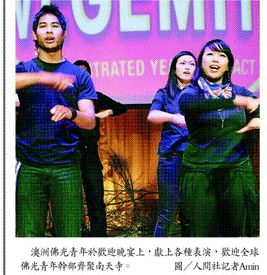 昨天的歡迎之夜,主持人陳劭彤、馮正浩身穿農夫裝,以濃厚澳洲腔的中英文,介紹來自十三國的佛光青年,澳洲原住民手舞足蹈的演出,為表演揭開序幕。