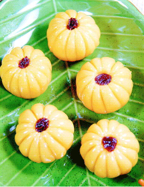 南瓜50g,糯米粉150g,玉米粉20g,植物白油20g,葡萄乾12粒,熱開水100㏄