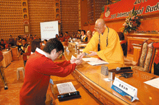 大會為兩百五十位青年舉辦「感恩祝福成年禮」,圖為墨爾本青年分團團長劉健行於成年禮中,代表全體青年宣誓,並簽下宣誓證書,由國際佛光會世界總會祕書長慈容法師見證、贈念珠結緣。文與圖/人間社記者心會、Amin