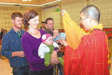 中天寺舉行毓麟祈福典禮,為Eva Watkin等十位嬰兒祈福祝禱,在大悲咒梵唄聲中,住持覺善法師為嬰兒灑淨祈福。圖/人間社記者吳秀華