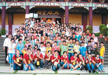 善化國中師生於大雄實殿前,歡喜自己成功挑戰朝山。人間社記者朱秘賢攝