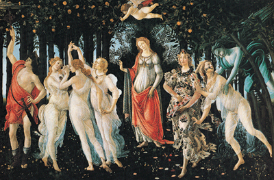 「春」的畫作(如圖),更令人牽戀著迷;畫中以盛裝的花神芙羅拉為中心,寓意她掌握四季的花朵,風神塞非爾(靠右有藍膚色者),從天而降,將口銜鮮花的春神芙羅娜送往花神芙羅拉身旁,以風力透過花神,將手中的鮮花撒向人間塵世,一時鮮花繚繞,花香四溢,春的消息色聲香俱下。中立為維納斯,懷著春之孕告之世人;維納斯上方的丘比特,於羽翼間將愛情的箭射向世間,左邊代表美麗、青春、歡樂三位女神,則舞起春之頌歌,婆娑曼妙,好不輕盈又復莊嚴,左邊的眾神使者默克萊‧赫姆斯,忙著將手中的法杖,撥開冬天的陰霾,宣告春天的正式降臨。