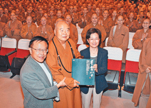 天下文化出版公司創辦人高希均(左)、天下遠見雜誌發行人兼總編輯王力行(右)贈《星雲八十》給星雲大師。人間社記者陳碧雲攝