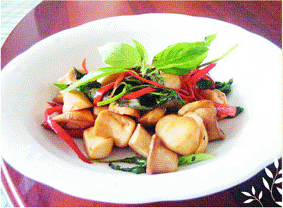 材料:杏鮑菇半斤、薑數片(或切絲)、紅辣椒一根、九層塔適量