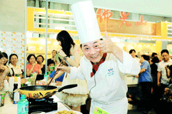 「各位師兄、師姐,阿彌陀佛!」阿基師昨一現身,即雙手合十向民眾致意。秉持健康料理的阿基師,以素食沙茶醬作調味,示範麵腸料理「柔腸寸斷」、營養滿分的「宮保酪梨」,及可作為主食的「養生果粒炒米鬆」,道道皆色、香、味俱全又健康,許多民眾在旁勤抄筆記。
