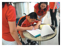學童的一舉一動、轉位移位、配合CP器材上課,老師用簡易的歌謠改編「雙腳踩平、背拉直、挺直挺直、抬頭拉胸、拉胸、拉胸……」一邊唱歌,一邊去指導CP學童跟著歌詞復健,在一唱一動之間,不知不覺學童在這種毫無壓力的情境中,成效很好;或是布置市場、水果攤位的場景,讓學童可以從日常生活中去感受到人我互動的一種學習。