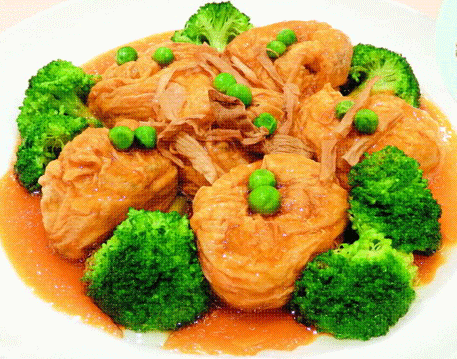 這道菜的材料變化性很高,內餡可豐可儉,家中剩餘的一些菜集合起來通常就夠了。只要把握材料不要太粗硬(怕撐破豆皮),切絲或切碎都很合適。料若備得多,可多做一些凍起來,隨時可拿出來用,風味完全不受影響。