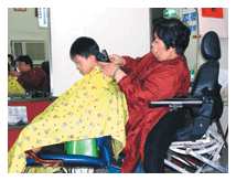 鄭素琴克服肢障,學習輪椅理髮獲得一技之長,自力更生。記者黃永順攝