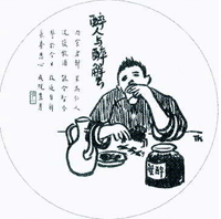 細觀此畫中的主角,一邊吃蟹,一邊喝酒,享用美酒佳餚原該快樂無比,但是看此男子的表情,愁眉不展,似乎一邊吃喝一邊陷入沉思之中。