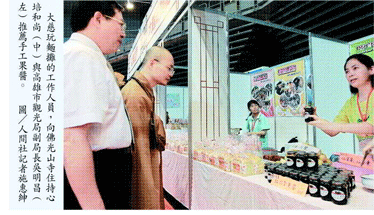 迎試吃品嘗!」大慈玩麵攤工作人員向佛光山寺住持心培和尚與高雄市觀光局副局長吳明昌大力推薦,果醬原料來自原住民採集的紅肉李,搭配大慈育幼院童製作香椿起士吐司,相得益彰,吸引許多人慕名前來的愛好者購買。