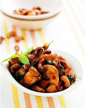 3.起油鍋放薑片爆香,入猴頭菇拌炒至金黃色,再放紅辣椒條與調味料1翻炒數下,勾薄芡淋上香油,起鍋盛盤後,灑上腰果和香菜、九層塔葉即可。
