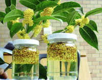 桂花生命短,經不得風雨,趁茂盛,按年年的習慣,釀兩瓶桂花滷。一早,將花朵仔細摘下,鋪上白紙,挑掉花萼及枯葉,蔭乾個半天,水分稍稍蒸發,就可以裝瓶了。