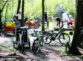 恩典滿半歲後,推著嬰兒車帶他到處趴趴走,取代了用背袋背他。有些媽媽喜歡騎腳踏車,有孩子後也不必擔心需要放棄騎單車,通常只要買一台接在腳踏車後方,供孩子們坐的安全座椅或小車箱,媽媽們仍可像往常一樣生活自如。